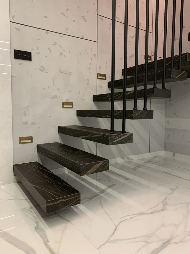 Schody wspornikowe jak i schody na belce centralnej wykonujemy ze spieku kwarcowego dostępnego w kilkudziesięciu różnych dekorach